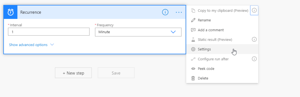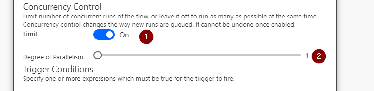 Sometimes it is desirable to only run one flow instance at a time. For example if you have a scheduled flow that are running at a set interval were you are processing some records, you normally do not want another flow instance to start running before you are done processing the first batch to avoid running the same records again. To avoid such scenario, you can enable concurrency control on the trigger. This is done by clicking on the three dots and selecting Settings
